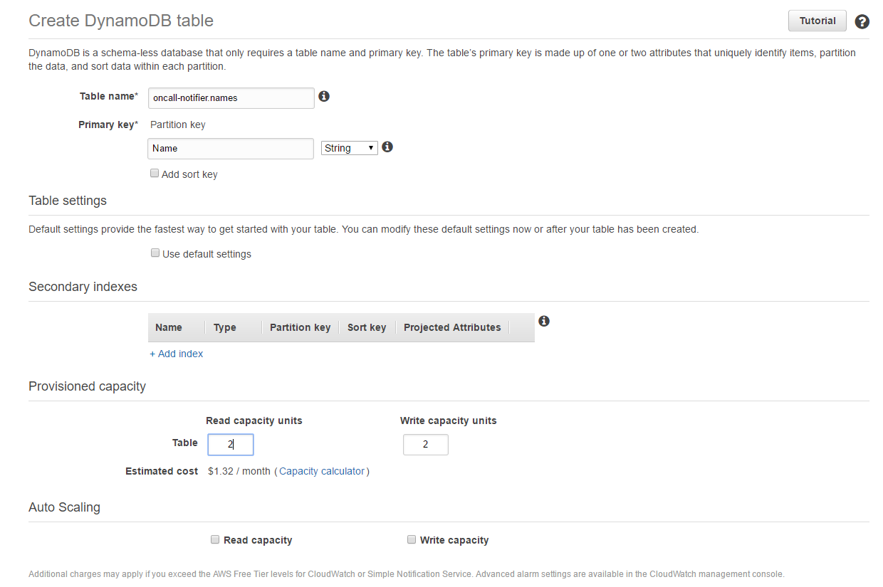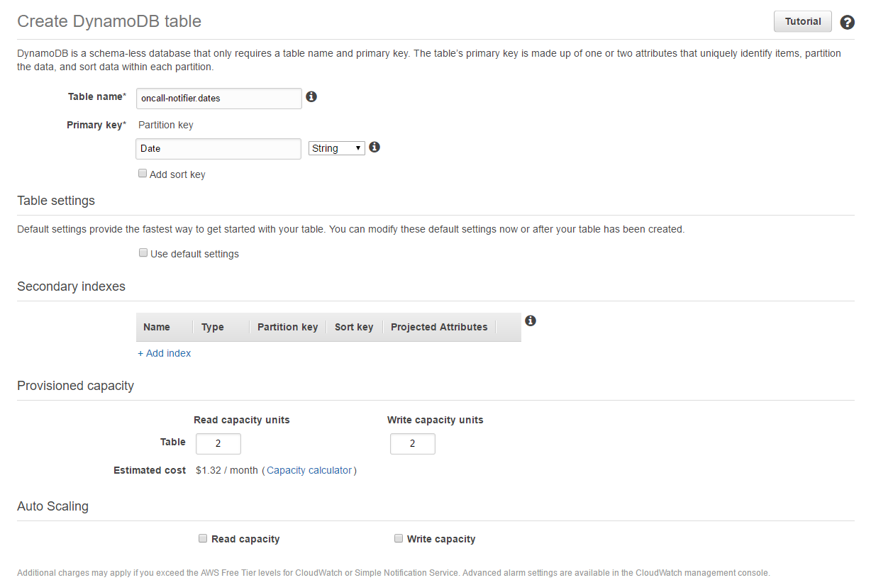 I turned off the auto-scaling feature and chose 2 units for read/write because we don’t really need performance for doing 2-3 queries per day.